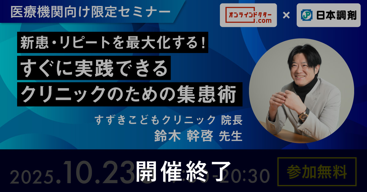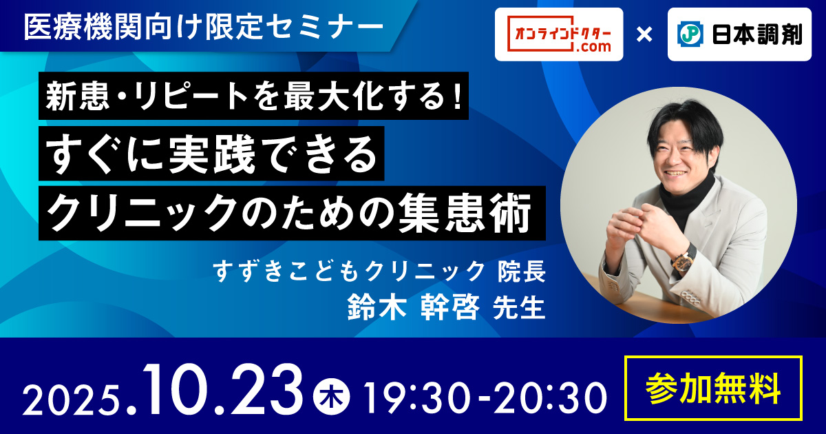 和歌山県人口2.6万人の地方都市にも関わらず、最大で1日350人の患者さまが来院する「すずきこどもクリニック」の鈴木幹啓院長が、その集患の秘訣を余すことなくお伝えします。本セミナーでは、すぐに実践できる具体的なノウハウも大公開。効果的なホームページの作り方はもちろん、WEB時代でも意外と効果の高い看板やDMといったアナログ施策、さらにオンライン診療を活用して全国から新患を集める方法まで、WEBとリアルを組み合わせた独自の集患術を解説します。なぜ地方のクリニックに多くの患者が集まるのか、その秘密に迫ります。